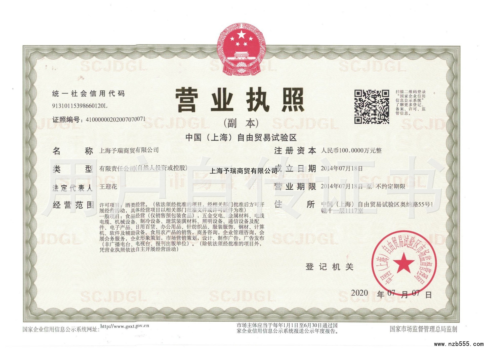 | 發(fā)證機(jī)構(gòu): | 中國(guó)(上海)自由貿(mào)易試驗(yàn)區(qū)市場(chǎng)監(jiān)督管理局 | 發(fā)證時(shí)間 : | 2020-07-07 |