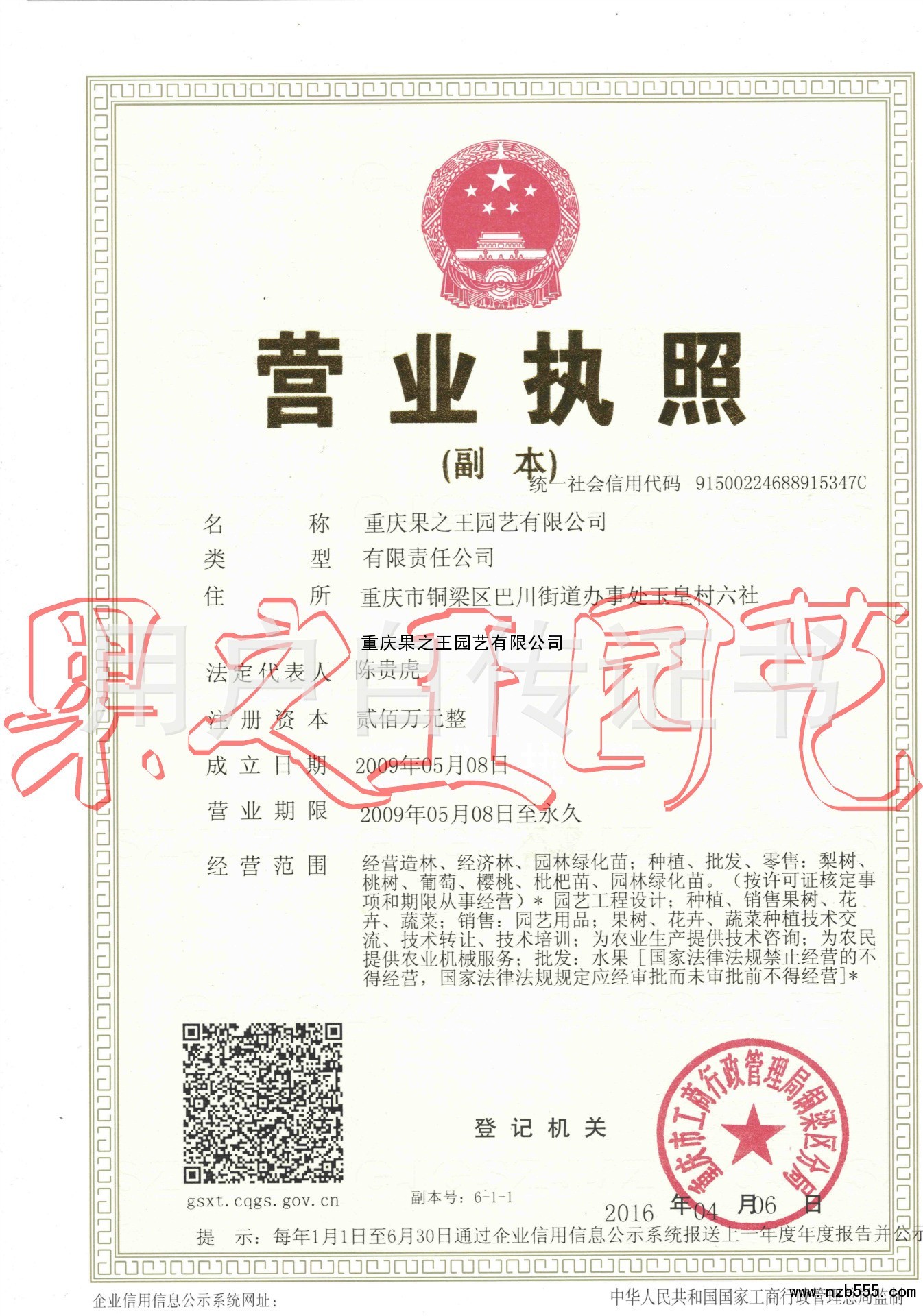 | 發(fā)證機(jī)構(gòu): | 重慶市工商行政管理局銅梁區(qū)分局 | 發(fā)證時(shí)間 : | 2016-04-06 |