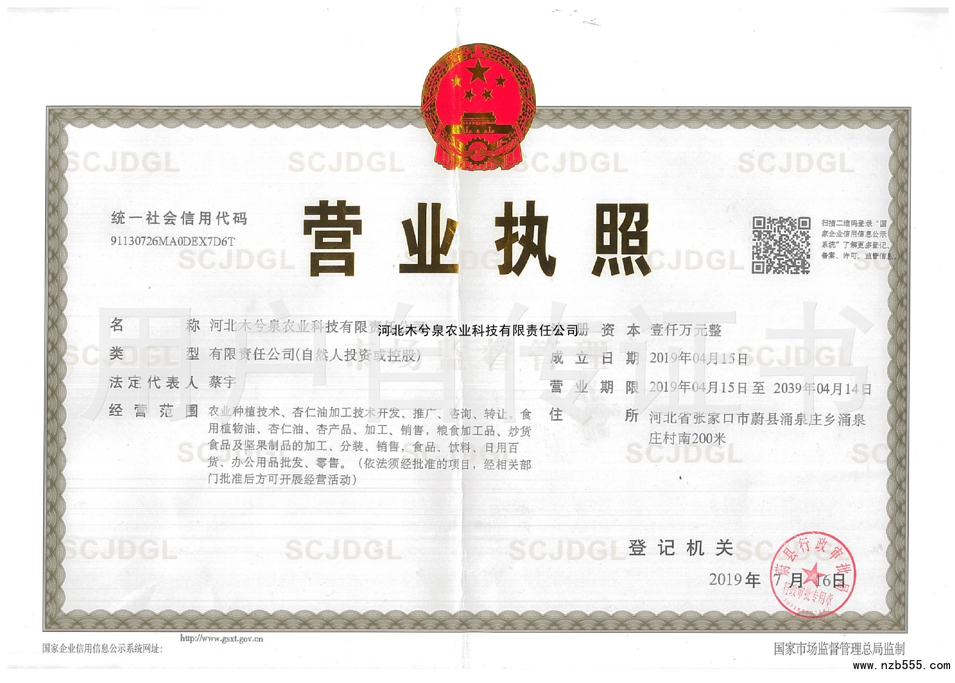 | 發(fā)證機(jī)構(gòu): | 蔚縣行政審批局 | 發(fā)證時(shí)間 : | 2019-07-16 |