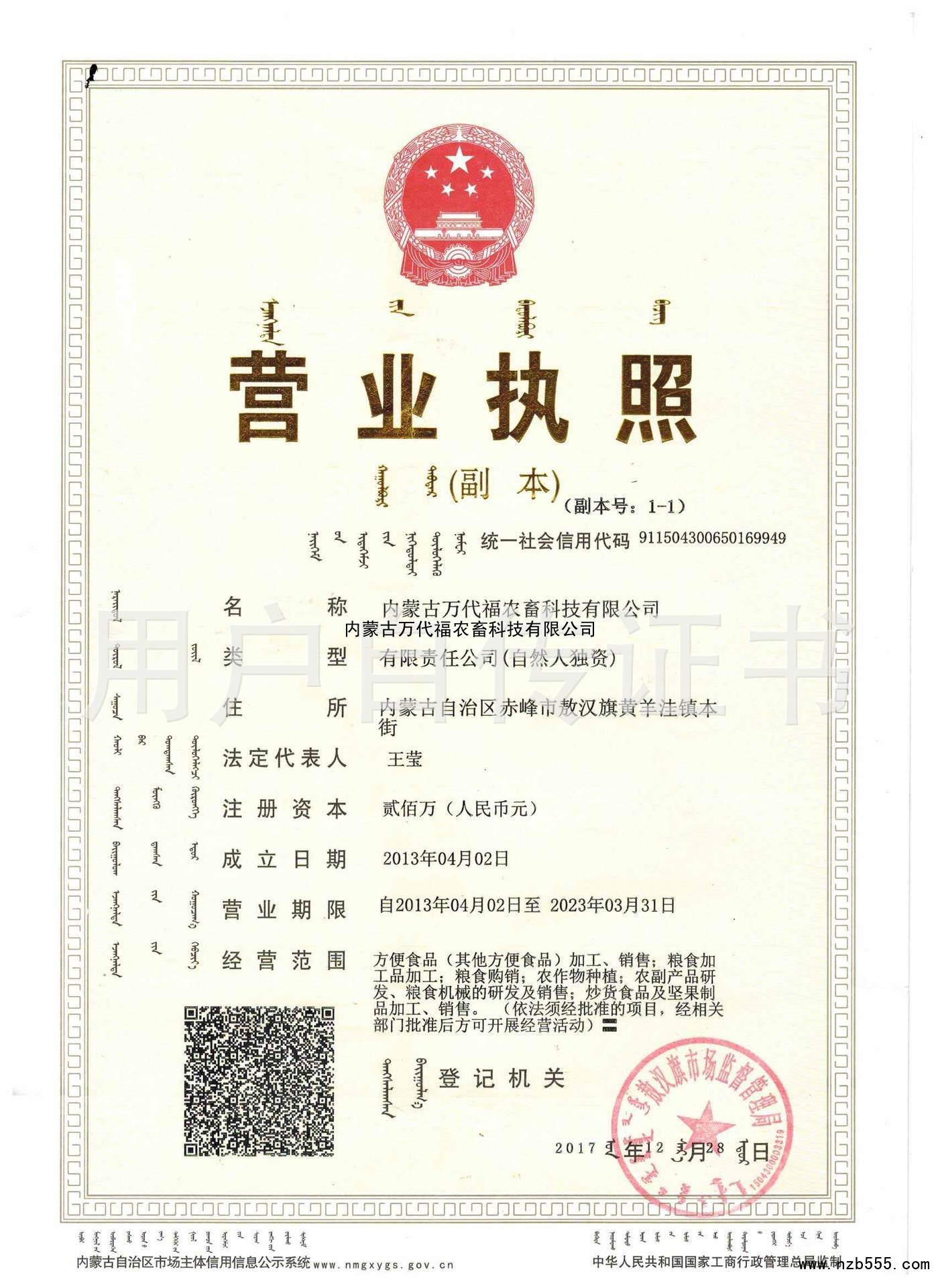 榮譽(yù)資質(zhì) 內(nèi)蒙古萬代福農(nóng)畜科技有限公司