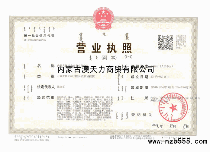 | 發(fā)證機(jī)構(gòu): | 呼和浩特市市場監(jiān)督管理局 | 發(fā)證時間 : | 2020-03-20 |