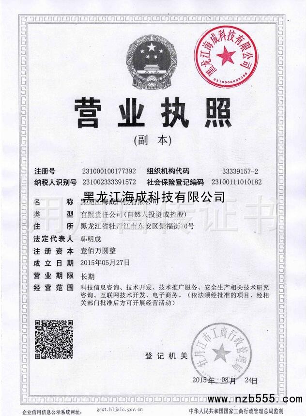 | 發(fā)證機(jī)構(gòu): | 牡丹江市工商行政管理局 | 發(fā)證時(shí)間 : | 2015-08-24 |