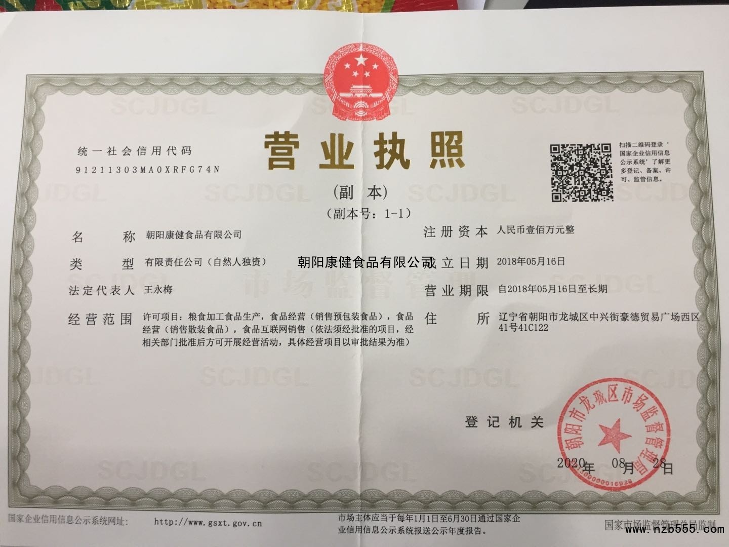 | 發(fā)證機(jī)構(gòu): | 朝陽(yáng)市龍城區(qū)市場(chǎng)監(jiān)督管理局 | 發(fā)證時(shí)間 : | 2020-08-28 |