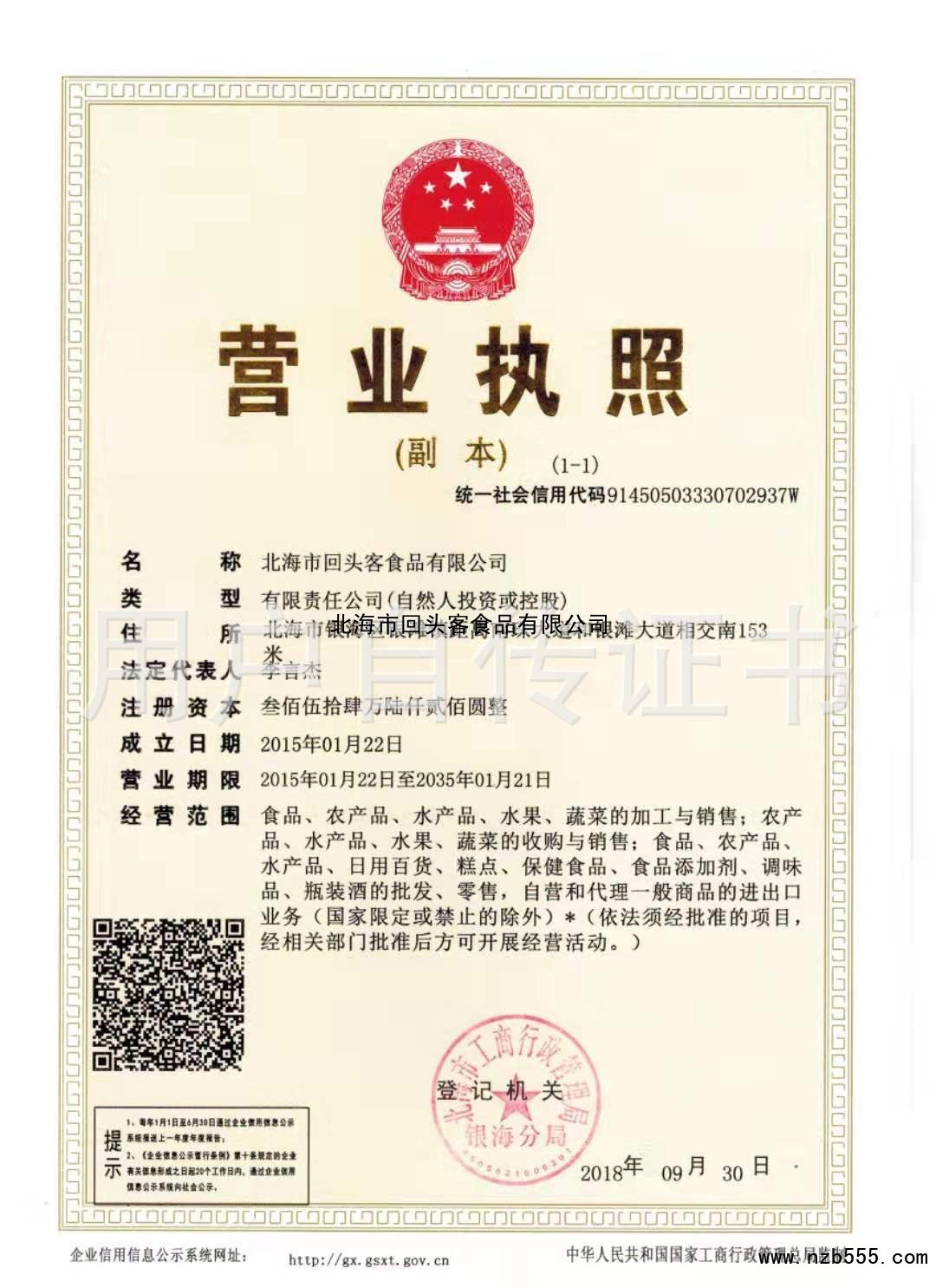 首頁(yè) > 榮譽(yù)資質(zhì) > 北海市回頭客食品有限公司
